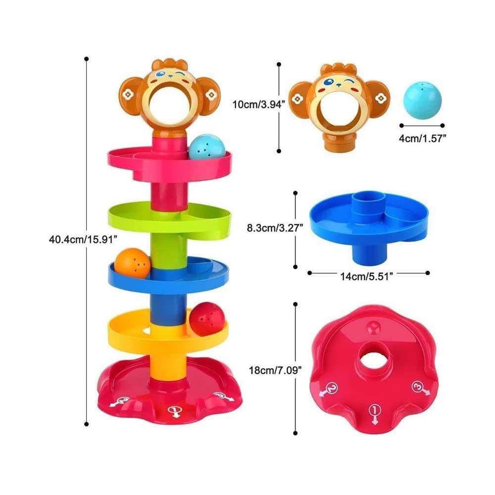 This 5 layer ball swirling tower includes three spinning acrylic activity balls that contain colorful beads and shapes for even more interactive play. Bright colors, interactive sounds, and intricate shapes enhance fine motor skills and problem solving skills. Perfect for babies first educational toy! This tower is easy to assemble and can also be broken-down easily, making playtime a breeze while you’re on the go. Big chunky track and monkey topper fit together smoothly to build into a fun-filled action ball ramp.